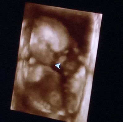 Ma position empêche de faire de jolies photos. Non seulement je suis de dos, mais en plus je me cache avec mes mains. Au moins, le docteur a pu voir que j'avais dix doigts.